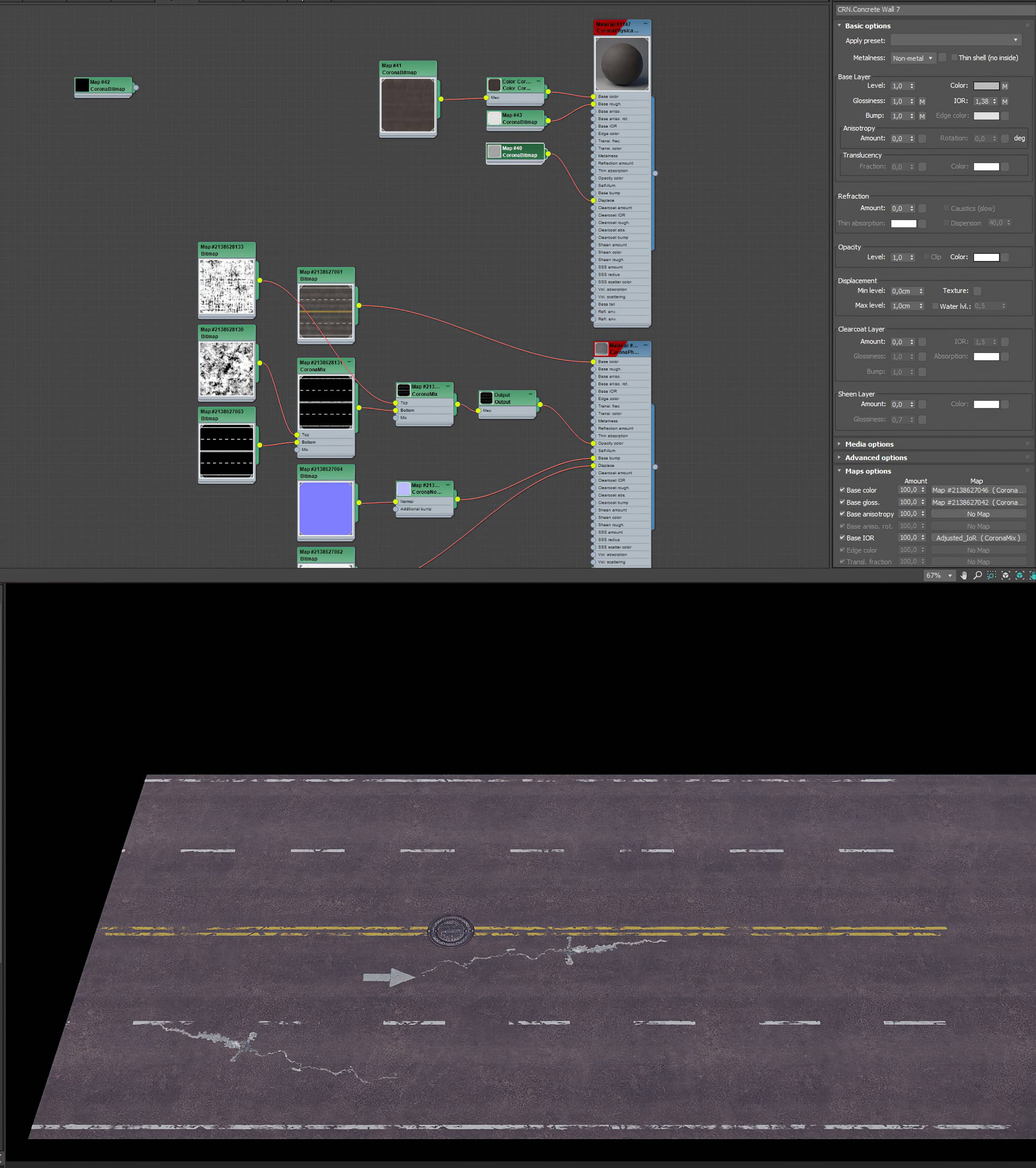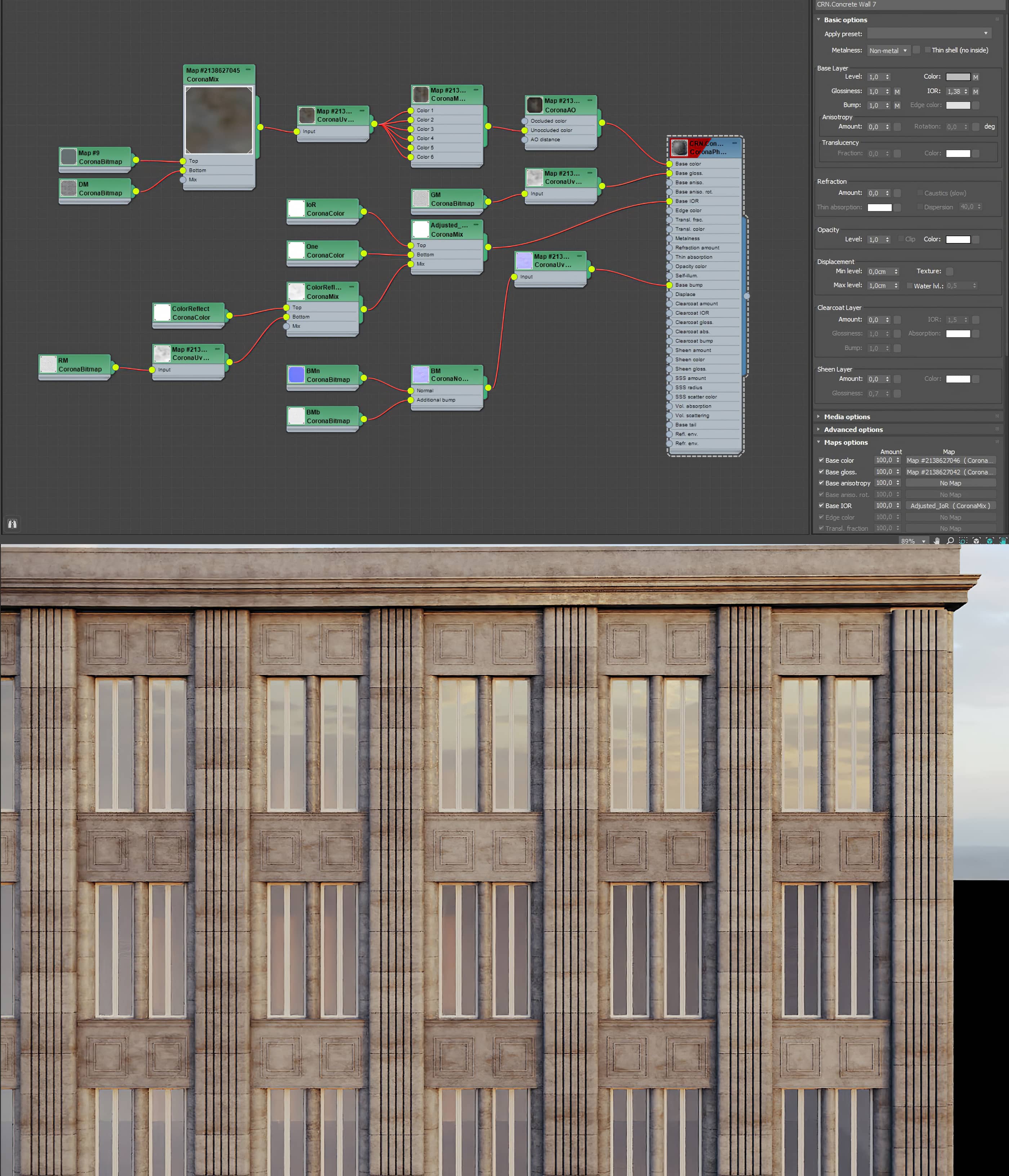Most materials start with a simple configuration while others require more complexity to create the desired randomness. I used maps such as Corona MultiMap, Corona UvwRandomizer, and Corona Mix.