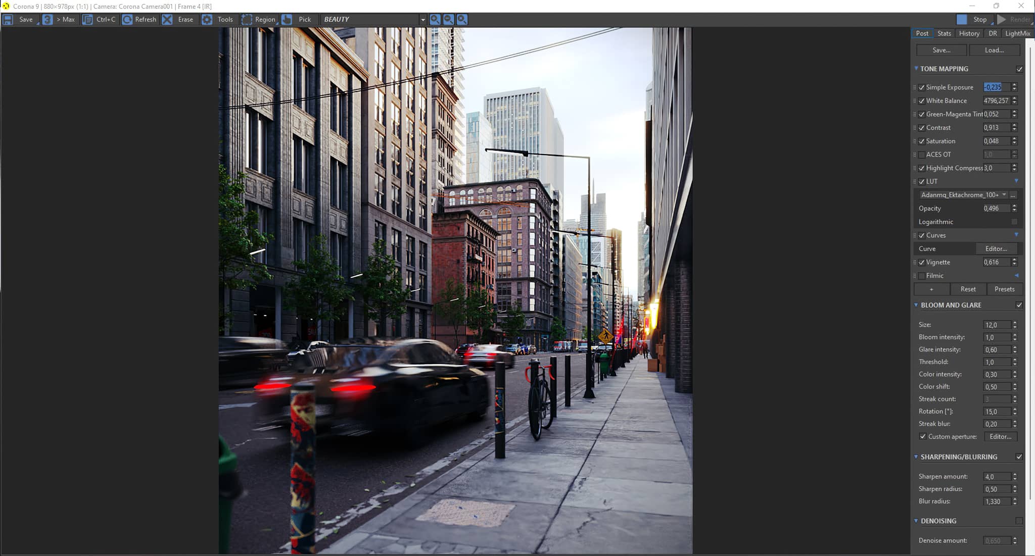 For the lighting, I started with Corona Sun but I didn't like the result so I ended up using an HDRI. For the camera, I made some significant changes to achieve the motion blur effect in the vehicles; to do this, I simply activated the Geometry option in the Motion Blur tab, and voila!!! (notice that vehicles must be animated too). "Automatic Vertical Tilt" and DOF ("Depth of Field") were also enabled.