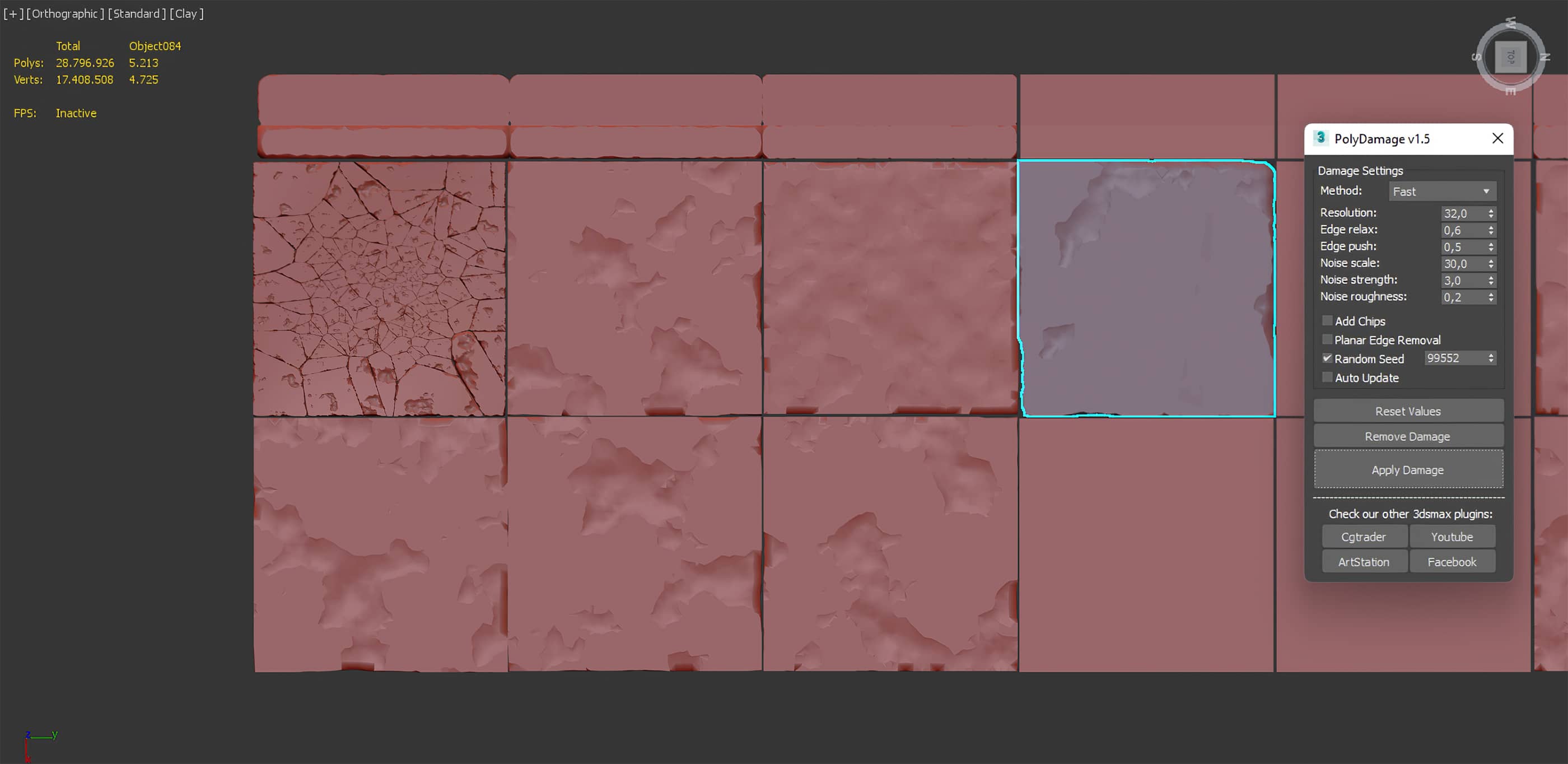 The sidewalks were generally treated using Edit Poly & Shell modifiers as well as a simple material. In the case of the foreground sidewalk, each piece was modeled independently. Polydamage and Rayfire plug-ins were used to add damages and cracks.